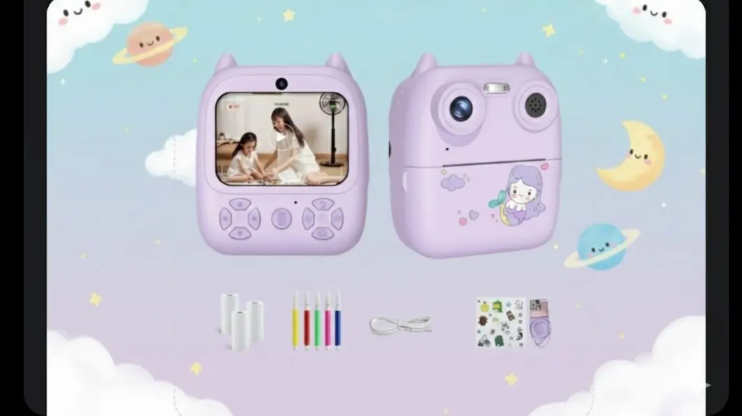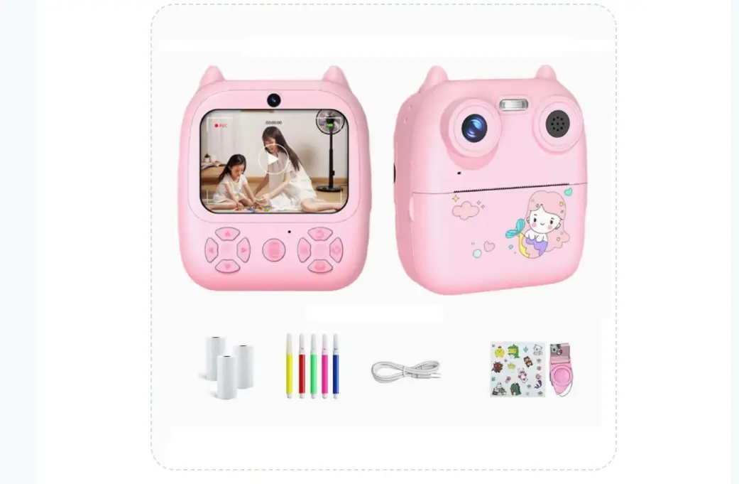 1 cámara de impresión para niños con 10 cm de alto x 9,5 cm de ancho X 4 cm de profundidad, 3 rollos de papel de impresión, kit con marcadores, 1 cable de carga, 1 correa para el cuello y 1 manual de usuario.