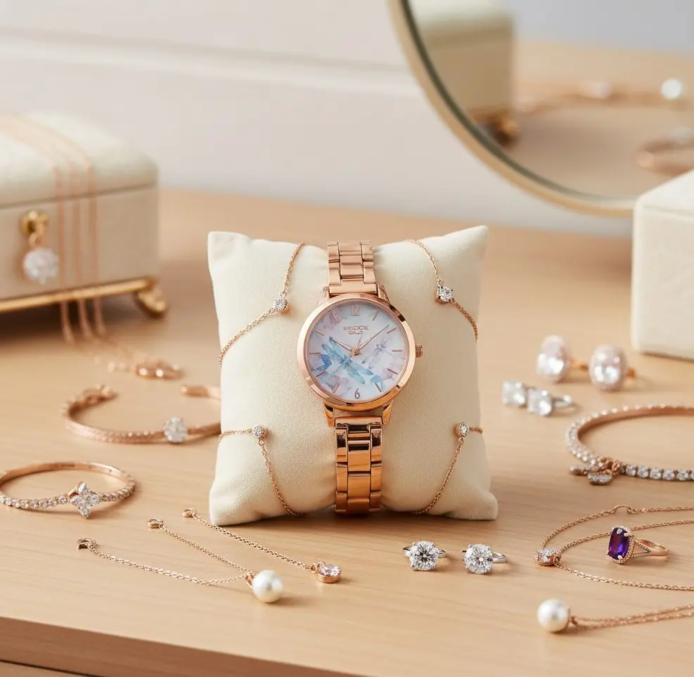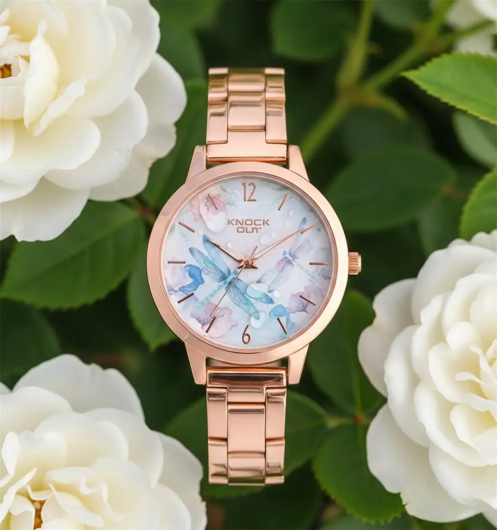 Reloj Knock Out con pulsera metálica en tono oro rosa, ideal para quienes buscan elegancia y un toque de originalidad. Su esfera destaca con delicados detalles florales en tonos pastel, aportando frescura y sofisticación a cualquier look. Perfecto para ocasiones especiales o para darle un toque chic a tu día a día.