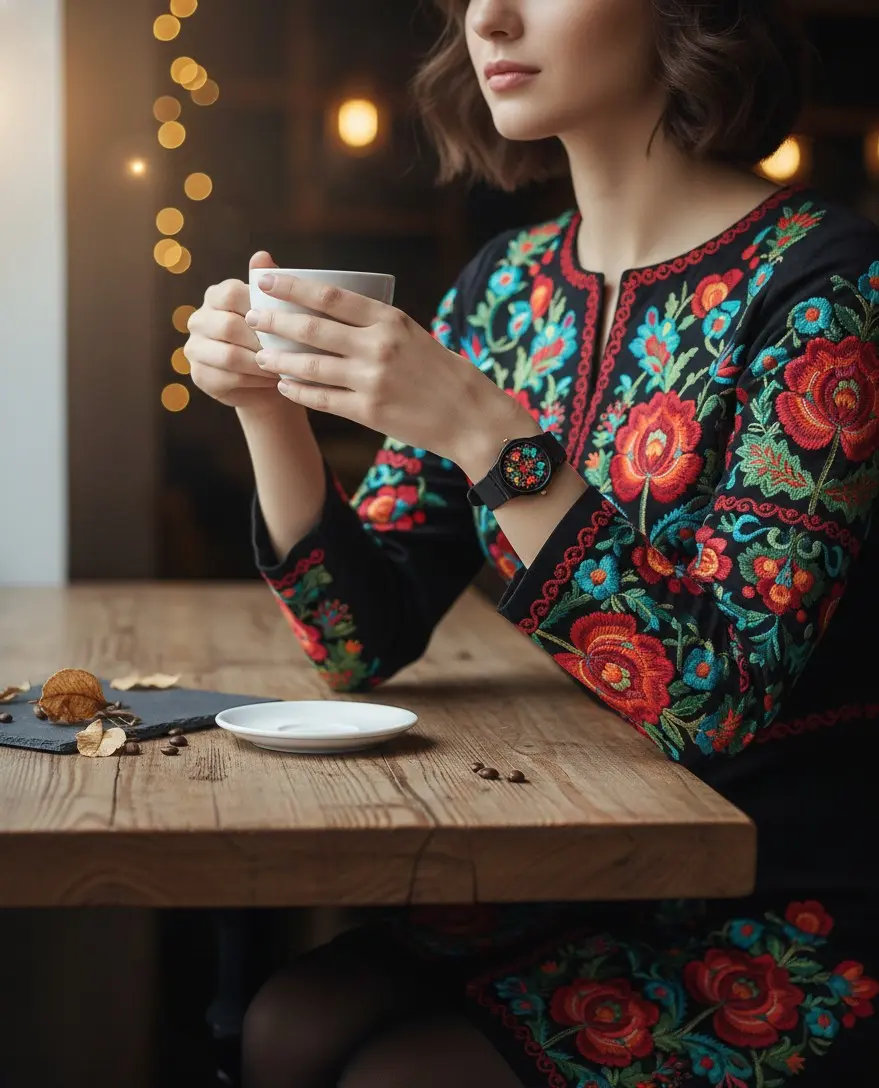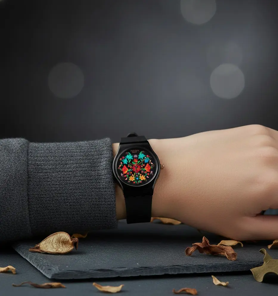 Diseño del Dial: Estampado floral multicolor (turquesa, rojo, amarillo) sobre fondo negro de alto contraste.