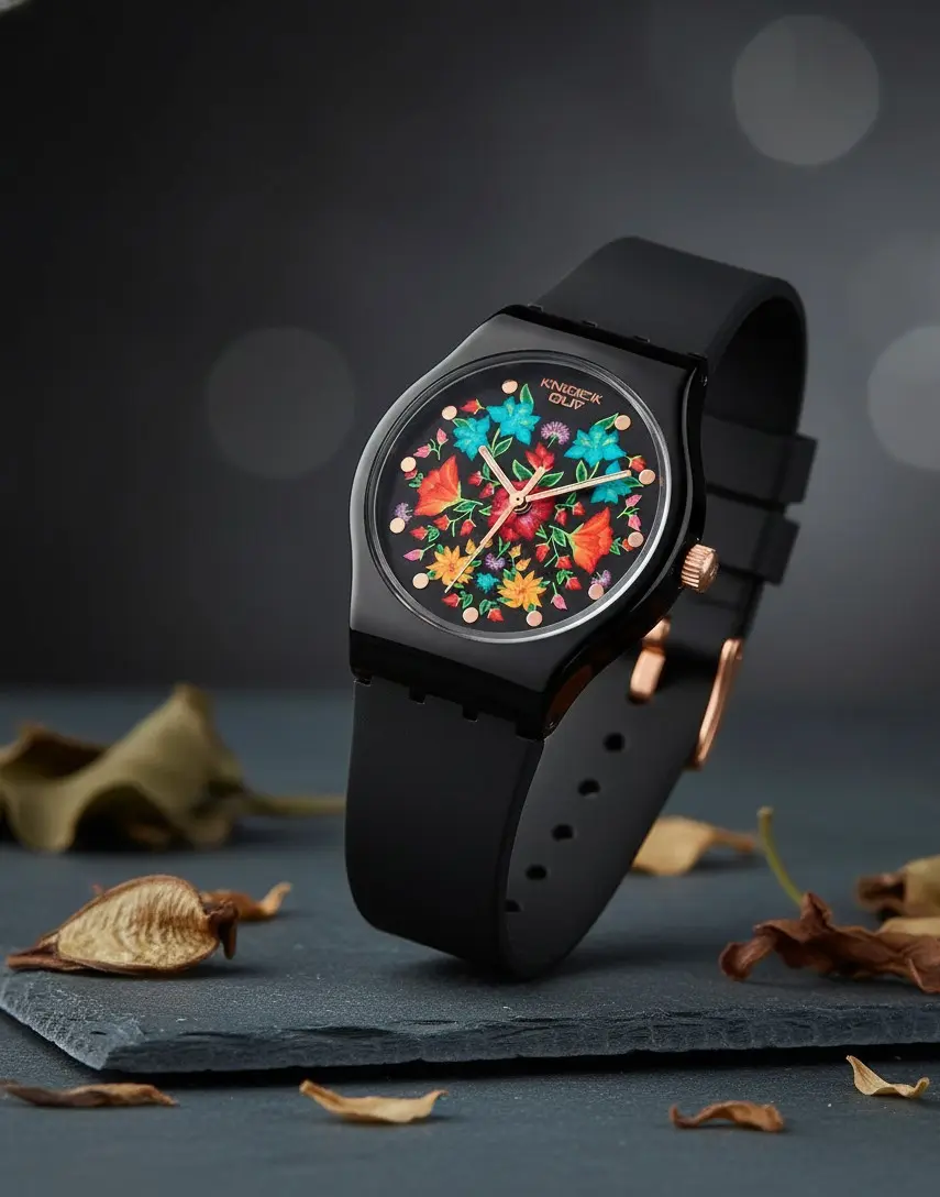 Reloj knout: la elegancia del negro se encuentra con la energía de las flores. Correa de silicona ultra cómoda y detalles en rose gold que enamoran. ✨ Diseño único. ✨ Comodidad absoluta. ✨ El regalo perfecto (o tu próximo auto-regalo)..